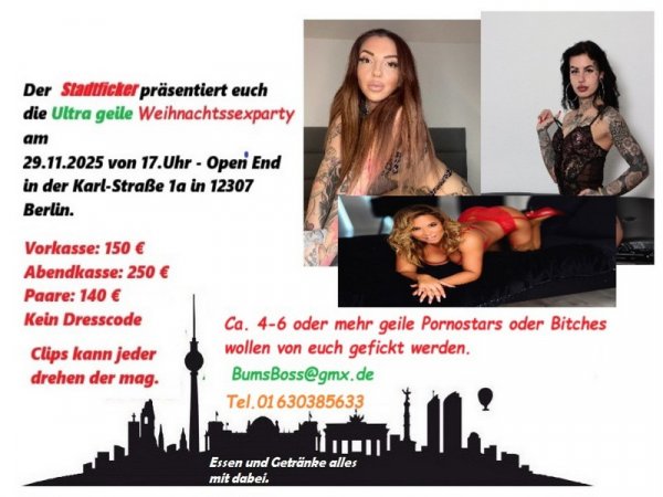 Hallo liebe Fans des Sex, der Erotic und des Pornos. Am 29.11.2025 findet nach fast 5 Jahren wieder eine ultra geile Weihnachtssexparty statt in Berlin Lichtenrade. 17.Uhr bis Open End. Essen und Getränke alles inklusive. Geiler Partykeller wo 4 bis 6 heisse Porno, Amateur und Privat Mädels da sind. Es gibt geile Action. Vorkasse 150 Euro. Abendkasse 250 Euro.
